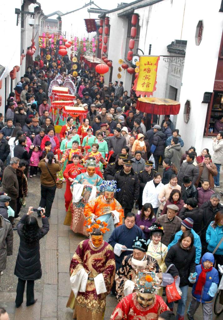 2006年2月2日,几名扮成“财神”的演员在江苏苏州古山塘街巡游。
