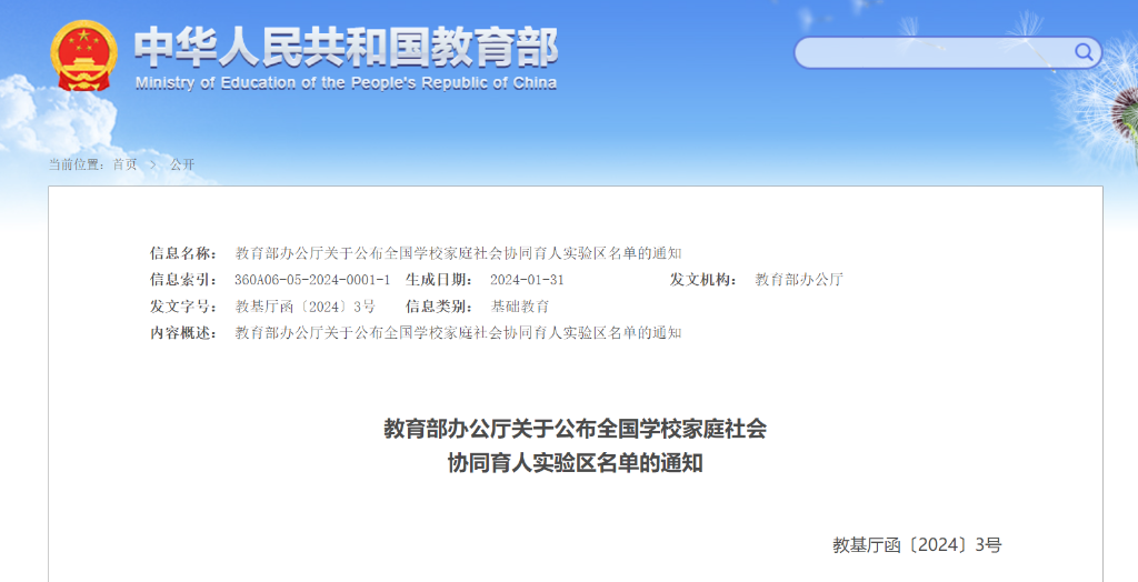 据介绍,为深入贯彻党的二十大报告中关于“健全学校家庭社会育人机制”的决策部署,认真落实教育部等十三部门联合印发的关于健全学校家庭社会协同育人机制的意见要求,积极推进协同育人体制机制改革创新试点,教育部开展了全国学校家庭社会协同育人实验区组织推荐工作。