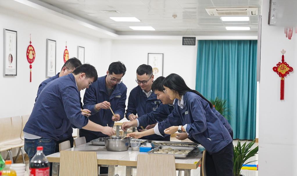 除夕夜,刘宝瑞(左三)和一起值班的同事正在包饺子。(尹青君 摄)