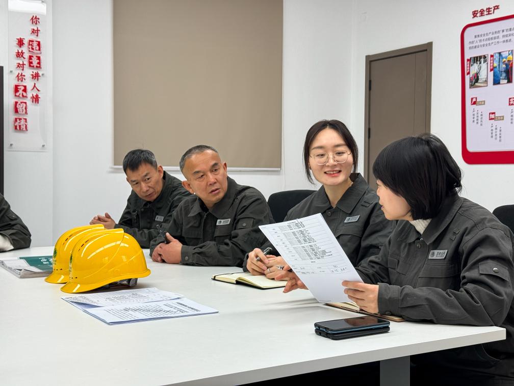 图为刘倩玲(右二)和同事正在开展班前会,对当天工作进行安排部署。(尹青君 摄)