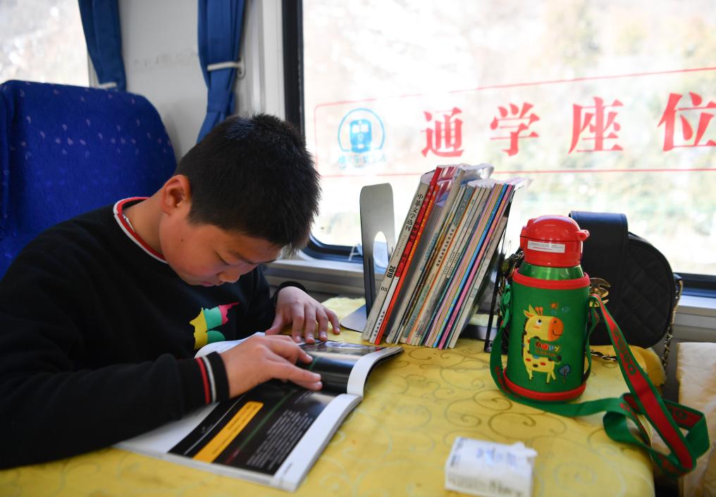 学生在6063次列车“通学车厢”阅读书籍。新华社记者张博文 摄