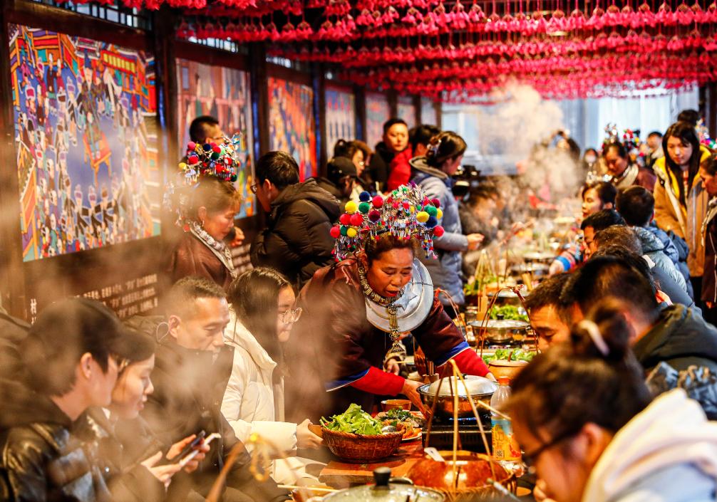 1月28日,在三江侗族自治县程阳八寨景区,游客在体验侗族百家宴。新华社记者 胡星宇 摄