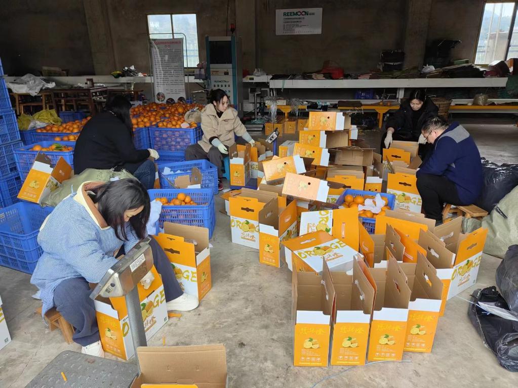重庆渝北区“乡村CEO”张晓丽(右二)与同事们一道将柑橘分拣装箱,准备发货销售。(魏兴凤 摄)