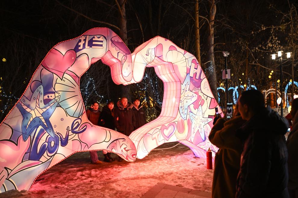 2月14日,市民、游客在呼伦贝尔市扎兰屯市吊桥公园赏灯游玩。新华社记者 贝赫 摄