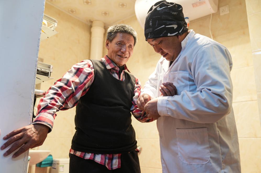 服务中心工作人员在帮助失明老人洗漱(1月30日摄)。新华社记者 晋美多吉 摄
