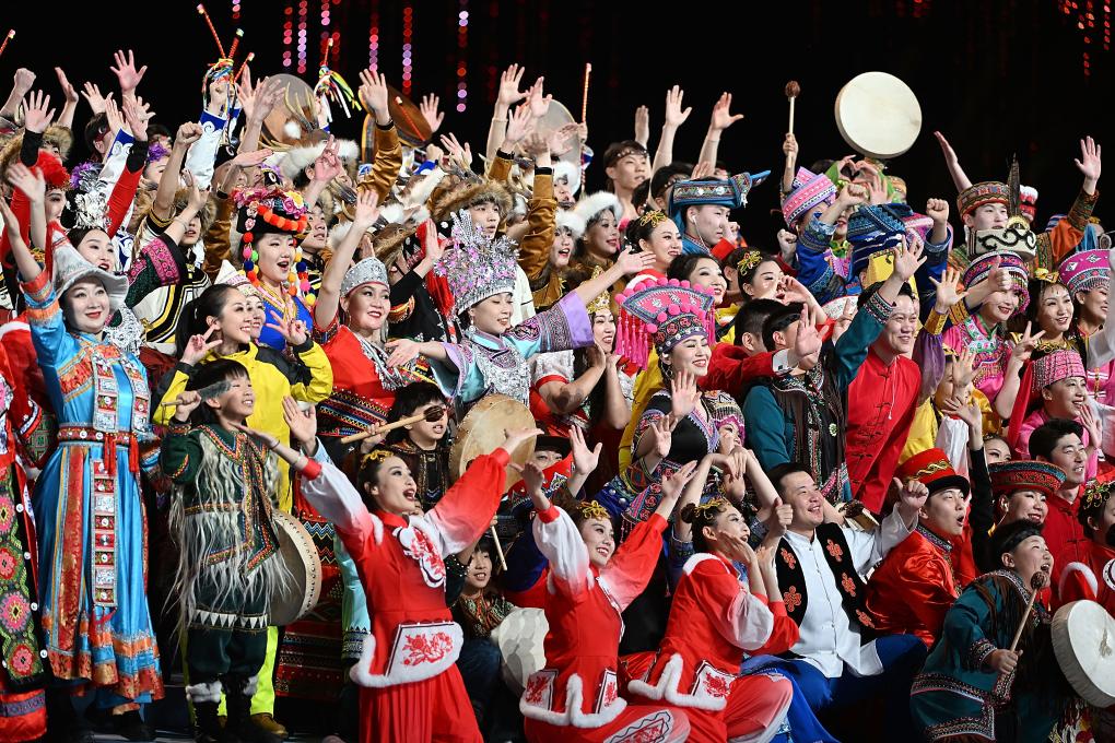 顶碗姑娘翩翩起舞,搏克手激情昂扬,舞台变为歌与舞的海洋。北疆的歌悠长、北疆的曲嘹亮,歌中唱出各族儿女携手奋进的壮丽图景,热情欢迎不以山海为远、共赴团结之约的新友故交。