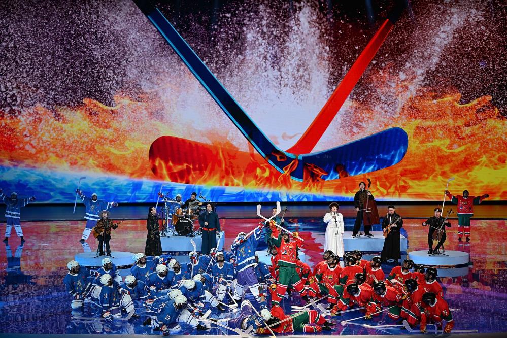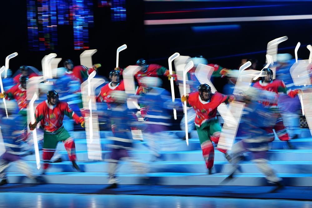 开幕式在内蒙古冰上运动训练中心速度滑冰馆内进行,导演团队把专业的冰道融入舞台中,将赛场也作为舞台的一部分。冰雪成为开幕式最重要的视觉元素,一片雪花唤醒沉睡的大地,冰球飞旋点燃运动激情。“更快、更高、更强——更团结”的奥林匹克格言与中华优秀传统文化相映生辉、澎湃激荡。