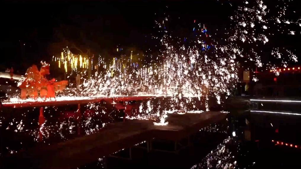 约1500摄氏度的铁汁被击打成10多米高的铁花,舞龙者赤膊上阵,一条金黄的“火龙”行云流水,穿梭其中。当万千铁花尽情绽放的一刹那,来自五湖四海的人们抬头仰望流光溢彩的夜空,在璀璨的光芒中许下美好愿景,充满烟火气的年味儿随之蔓延。