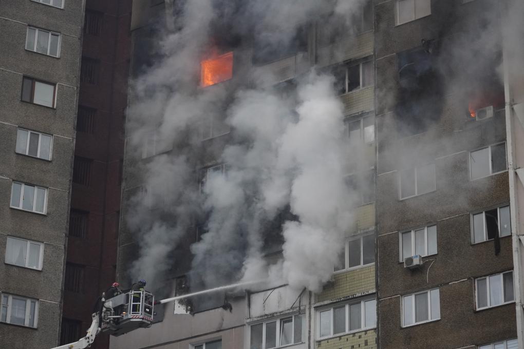 2月7日,消防员在乌克兰基辅为被导弹碎片击中的居民楼灭火。综合乌克兰各地官方消息,俄罗斯军队7日对乌首都基辅等地发动的新一轮空袭造成5人死亡、51人受伤。新华社发(罗曼·佩图什科夫摄)