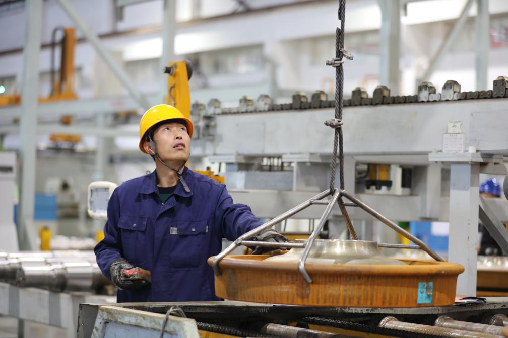 2023年4月18日,工人在位于黑龙江省齐齐哈尔市的中国一重生产车间进行生产作业。