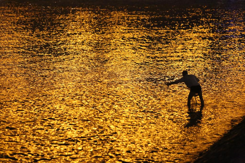 2023年8月27日,一名男子在哈尔滨松花江畔拾捡垃圾,清理江岸。