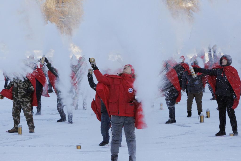 2023年12月22日,在漠河市北极村,游客在冰封的黑龙江上体验泼水成冰。