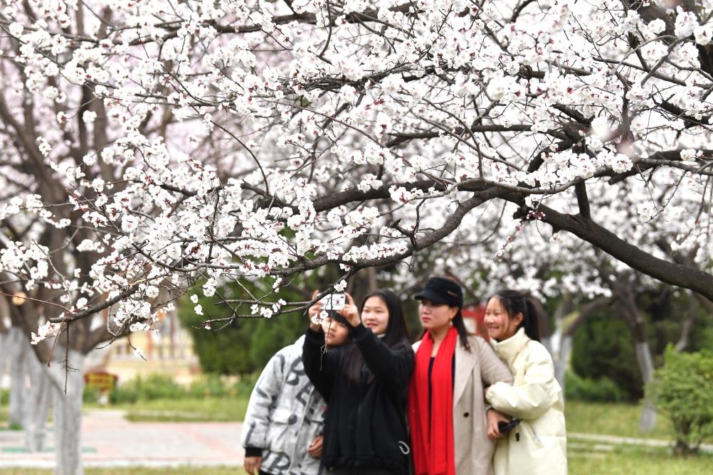 2021年雨水节气后,市民在安徽省亳州市内公园杏花林中赏花游玩。