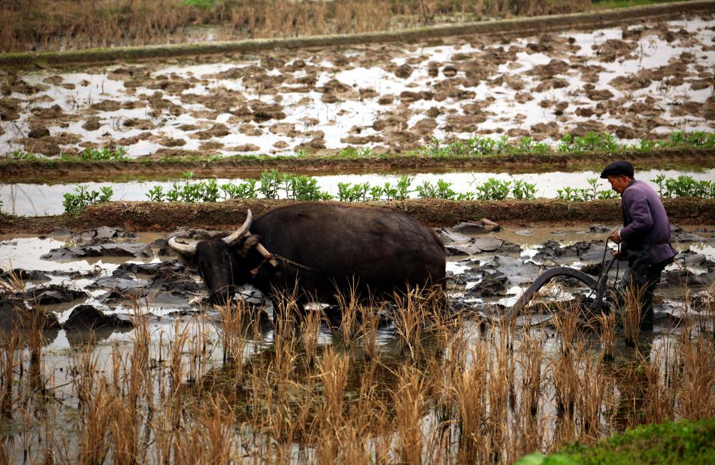 2013年雨水时节,四川省华蓥山区的农民在翻耕冬水田,为春耕生产作准备。
