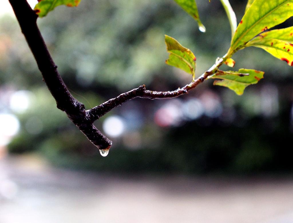 2013年雨水时节,上海市江苏路旁的树梢上雨滴滴落。