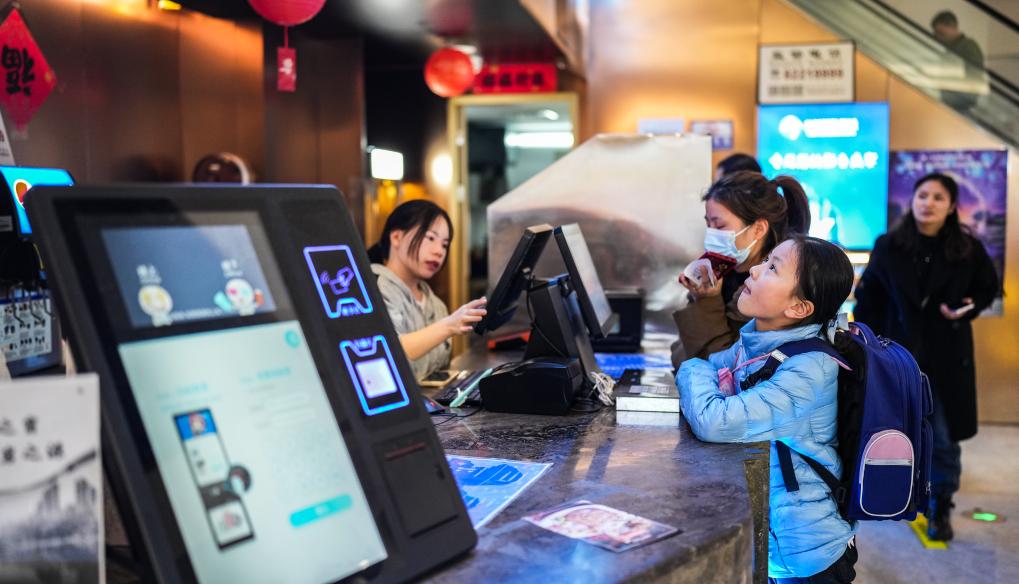 2月18日,小朋友在贵阳市云岩区益田国际影城选购电影票。新华社记者 陶亮 摄