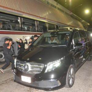 2月18日清晨,在泰国曼谷的泰国警察医院,在此治疗和服刑的他信乘车离开。新华社发(拉亨摄)