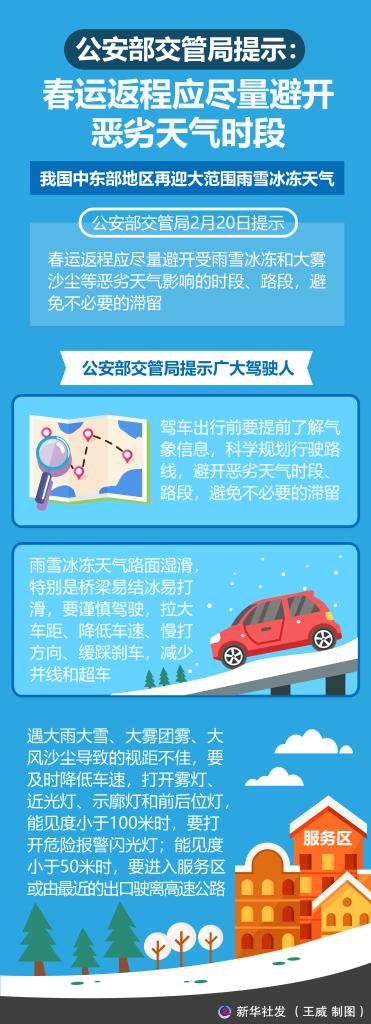 新华社北京2月20日电(记者任沁沁)我国中东部地区再迎大范围雨雪冰冻天气,公安部交管局20日提示,春运返程应尽量避开受雨雪冰冻和大雾沙尘等恶劣天气影响的时段、路段,避免不必要的滞留。