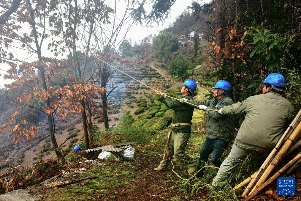 2月20日,国网宜昌供电公司运维人员在五峰土家族自治县五峰镇开展线路特巡,并对重点区域通道进行清理。新华社发(邱晟摄)