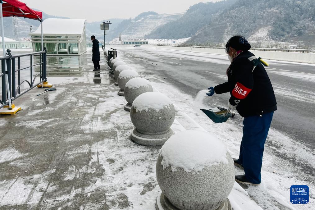 2月20日,中国铁路武汉局集团公司十堰车务段工作人员在十堰东站前撒盐除雪。新华社发(江戎阳 摄)
