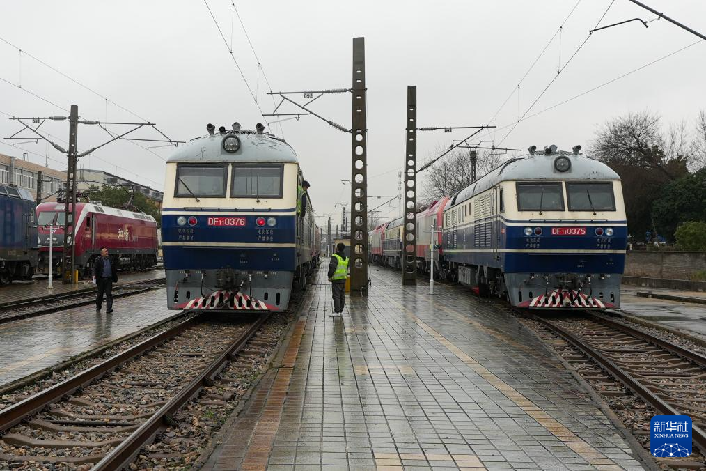 2月20日,在中国铁路武汉局集团公司武昌南机务段,10台整备完成的机车整齐地停放在铁轨上。冻雨降临时,这五组机车将按照1台内燃机车加1台电力机车组合的方式,上线打冰除雪。新华社发(刘崎超 摄)