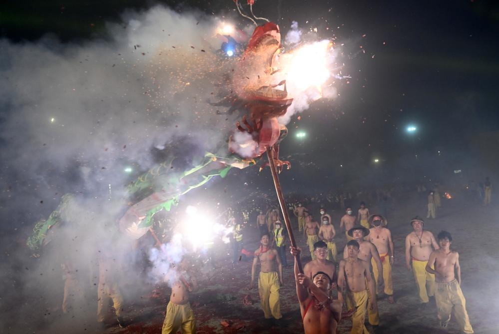 记者20日傍晚时分在宾阳县看到,舞龙活动正式开始。舞龙人有的头戴藤帽、身着传统的黄色舞龙服;有的则赤膊上阵,在鞭炮声中勇敢地舞龙。