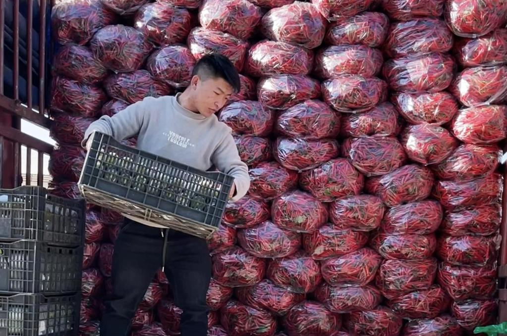 晚上7点左右,天色已黑,小米椒、四季豆、灯笼椒等蔬菜,已陆陆续续装进老章的货车。没过多久,菜贩子老冯开着皮卡,趁着夜色又运来了600斤荷兰豆。