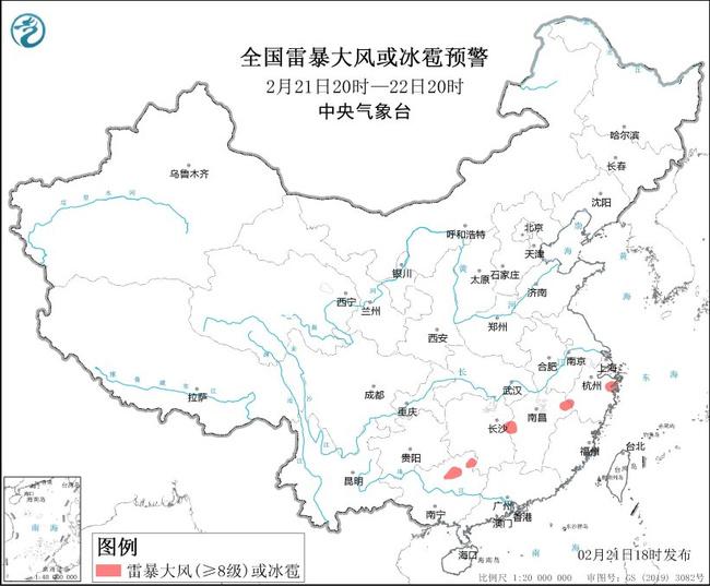 中央气象台2月21日18时继续发布强对流天气蓝色预警: