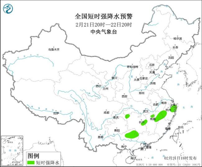 预计2月21日20时至22日20时,江西西部、浙江东部、广西东北部等地的局地将有8-10级雷暴大风或冰雹天气;湖南西南部、江西中北部、浙江中北部、福建西北部、广西东北部等地的部分地区将有短时强降水天气,最大小时雨量20-30毫米,局地可达40毫米以上。