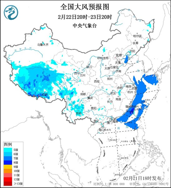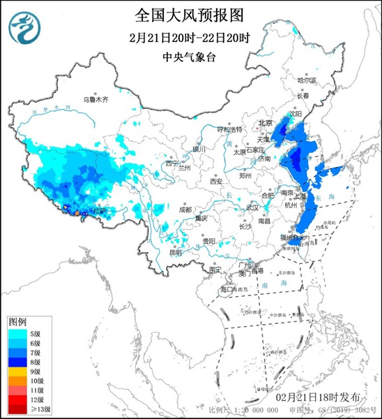 预计,2月21日20时至22日20时,西藏中西部、青海西南部、辽东半岛、山东半岛等地的部分地区有5~6级大风,阵风7~8级;渤海、黄海中部和南部海域、东海西部海域、台湾海峡将有7~8级、阵风9级的偏北到东北风。