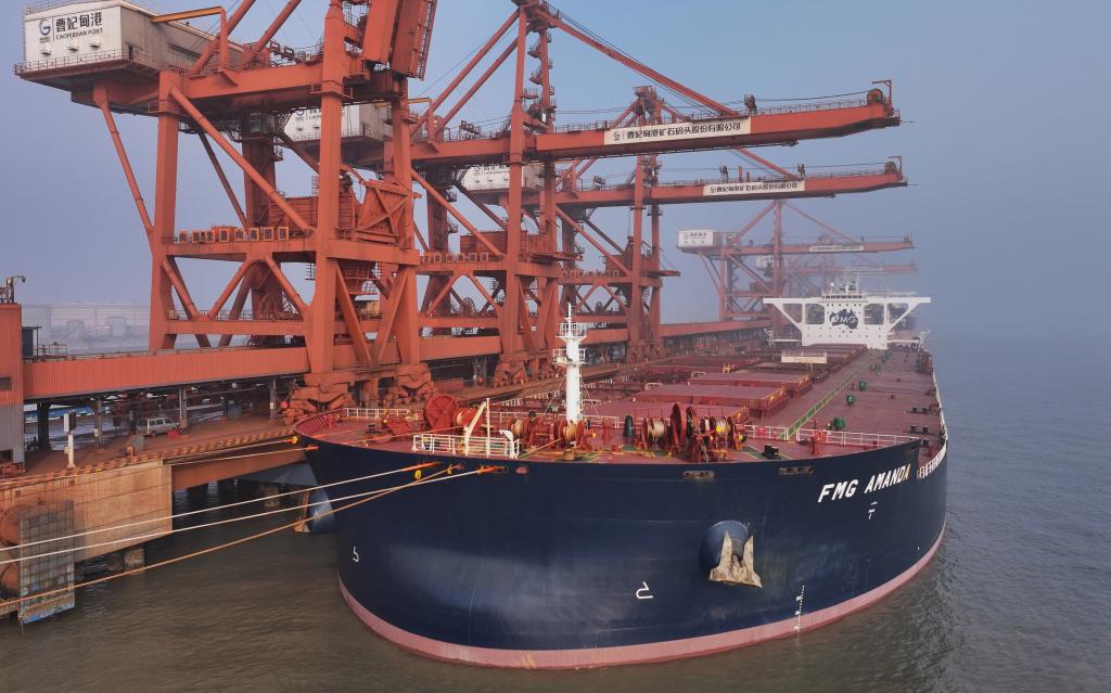 一艘货轮靠泊在唐山港曹妃甸港区矿石码头。新华社记者 杨世尧 摄