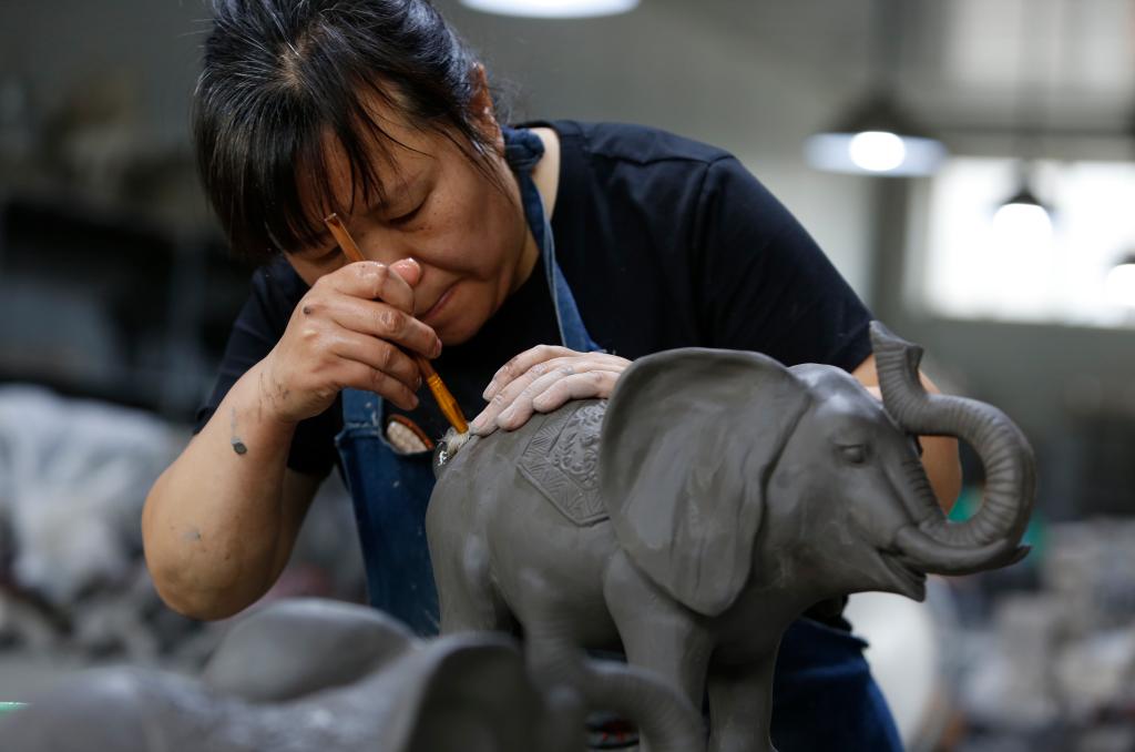 2023年7月19日,工人在加工泥胎。