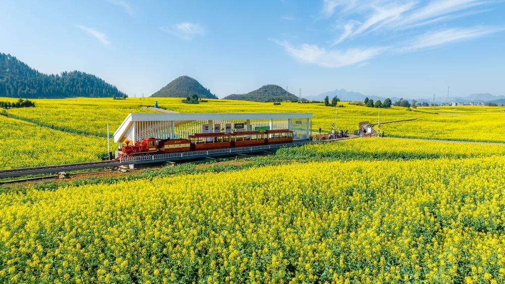 同样来到景区打卡的滕兰一家三口,却选择了另一种赏花的视角——坐上小火车。“我们在网上看到,最近花开得正好,便过来打卡。”滕兰说,乘坐小火车可以深入花田内,近距离观赏油菜花美景。