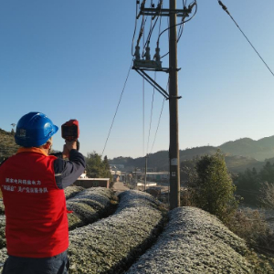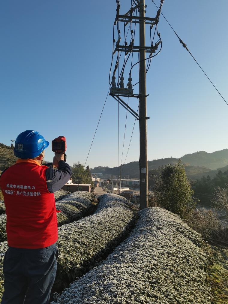 1月23日,在福建省漳州市南靖县高港村,国网南靖县供电公司船场镇供电所工作人员使用红外测温仪检测设备状况。(赖伟锋 摄)