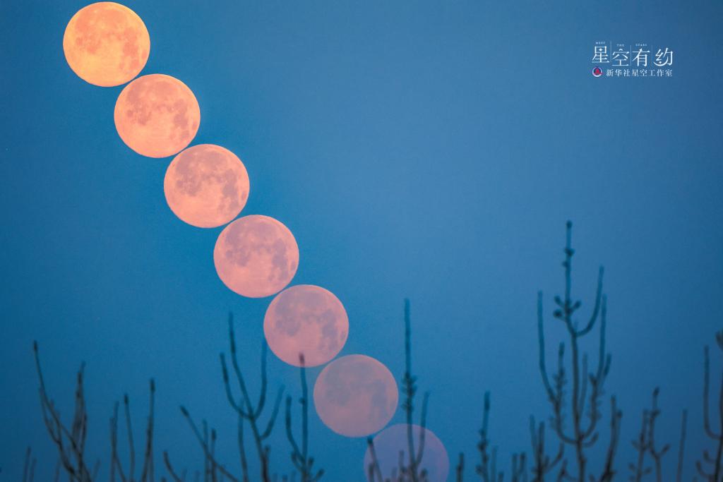 2023年2月5日,元宵节,“十五的月亮十六圆”。这是北京市星空摄影爱好者王俊峰2月6日在北京丰台区拍摄的“月落过程”(多张叠加)。(本人供图)