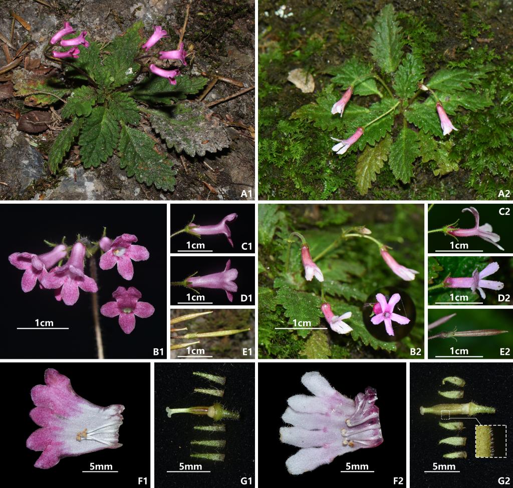 2022年6月19日拍摄的巫溪马铃苣苔(左)和毛蕊金盏苣苔(右)的解剖对比图。(陈锋 摄)