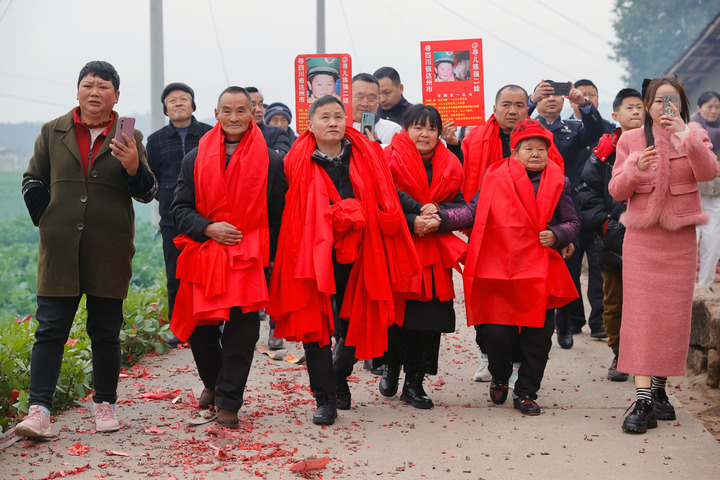 在家人簇拥下,游子终于踏上回家的路。姐夫把迎接亲人回家的鞭炮从村口放到了家门口,烟花、礼炮齐鸣,17桌“坝坝宴”坐满前来道贺的父老乡亲。