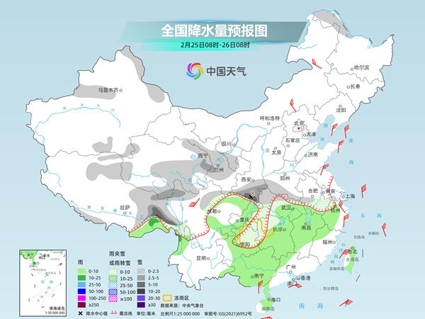 昨天,我国雨雪范围仍然较大,雨雪强度有所减弱,监测显示,湖北、湖南、安徽和江苏等地出现雨雪冰冻天气,青海东部、安徽中部、江苏西部、湖北东部等地部分地区出现中到大雪,湖北荆州、咸宁、武汉、黄石和安徽安庆等地暴雪。湖北东南部、安徽南部、江苏西南部、江西西北部、湖南东北部及西藏东南部、云南西北部等地部分地区出现雨夹雪5~15毫米,江西南昌局地26毫米。贵州中东部、湖南中南部、湖北东部、安徽中西部等地出现冻雨。江西中北部、浙江南部、福建西北部等地出现中到大雨,江西鹰潭和上饶,浙江丽水、衢州和台州,福建南平等局地暴雨,江西上饶局地100~149毫米。