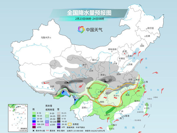 今天(2月23日),我国中东部等地大范围雨雪持续,降水强度继续减弱,不过陕西南部、湖北东部和南部等地部分地区仍有大雪,局地暴雪,湖南、贵州等地有冻雨。明后天,北方大部降雪停歇,南方仍有雨雪天气。预计南方多阴雨的天气格局将延续至月底,大部地区气温也持续低迷,公众春运出行需注意防范。