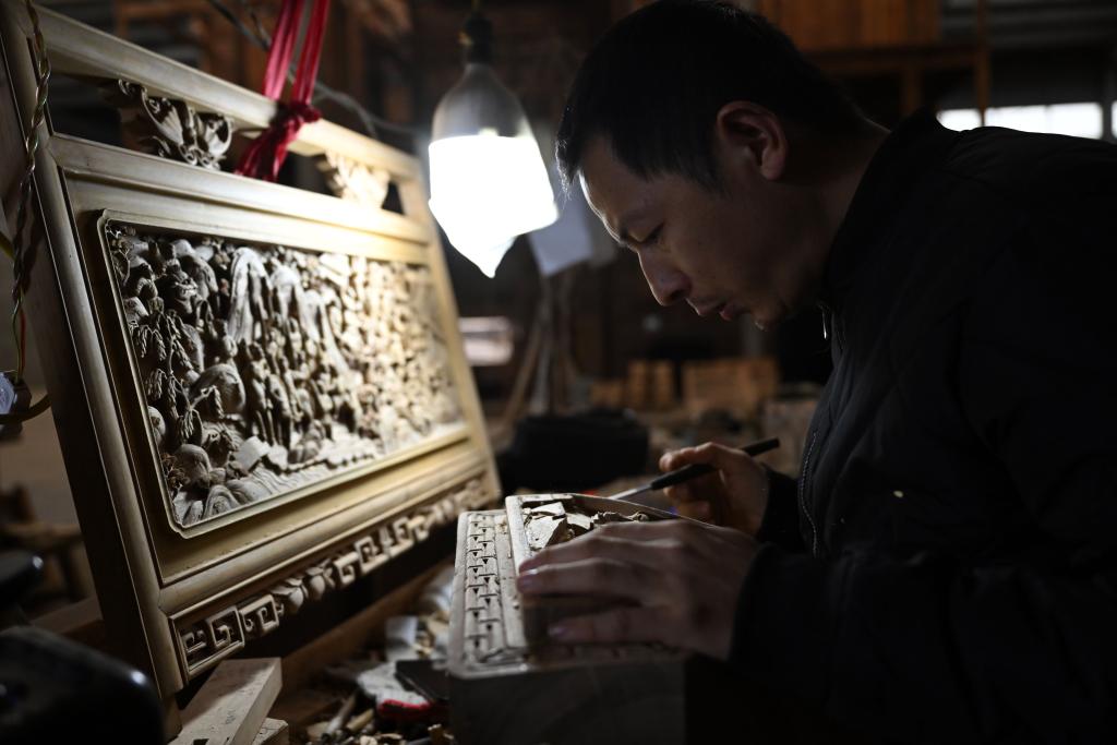 砖雕、木雕、竹雕、石雕……在位于安徽省行知学校的一间间教室里,不同专业的学生正在非遗大师和资深工匠的指导下潜心练习徽派建筑的雕刻营造技艺,“90后”小伙周明德就是其中一员。大学毕业后,对传统文化深感兴趣的他决定到这里“拜师学艺”。