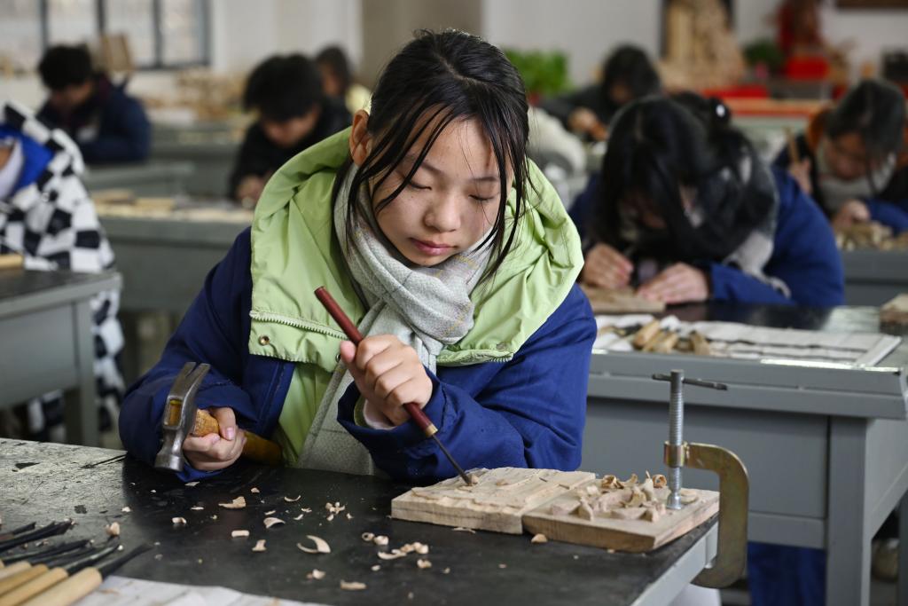 在位于黄山市歙县的行知学校,学生在学习非遗木雕制作。新华社记者 周牧 摄