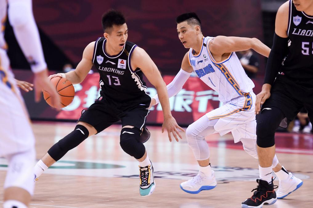 2020年6月20日,辽宁队球员郭艾伦在比赛中带球突破首钢队球员林书豪的防守。新华社记者 李紫恒 摄