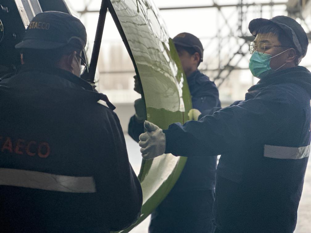 在山东太古飞机工程有限公司维修部“客改货”车间,两架“客改货”飞机正进行交付前的最后准备,淡绿色的货舱门已严丝合缝安装至雪白的机身,多名工作人员正有序作业。“这架货机下周就能交付,别看这舱门现在挺突兀,等过两天涂装过后可就帅多了!”今年23岁的技术员刘港说。