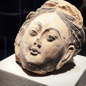 新疆屯垦历史博物馆展览的唐代泥塑佛头。新华每日电讯记者 赵晨捷 摄