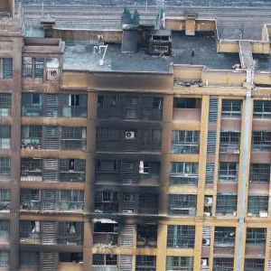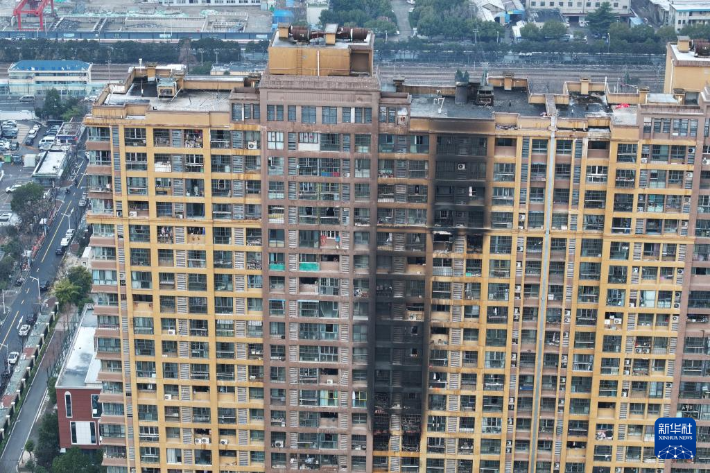 2月23日拍摄的明火扑灭后的南京市雨花台区明尚西苑6栋(无人机照片)。新华社发(方东旭 摄)