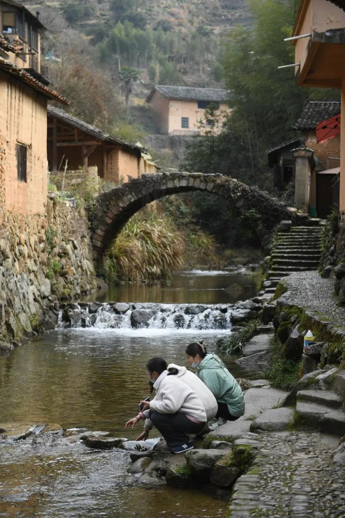 1月31日,游客在三都乡松庄村老石桥前嬉水。