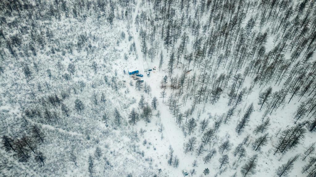 这是2023年1月12日拍摄的驯鹿饲养人在大兴安岭林区深处的临时放牧点(无人机照片)。新华社记者 彭源 摄