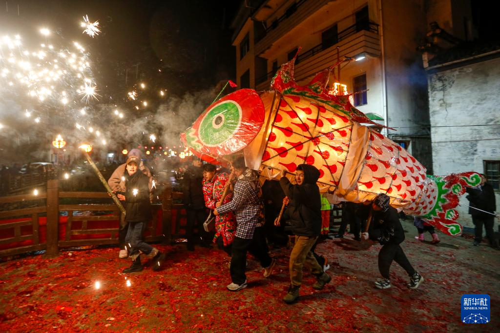 2月22日,在安徽省黄山市歙县溪头镇汪满田村,鱼灯表演队伍在村中嬉游祈福。