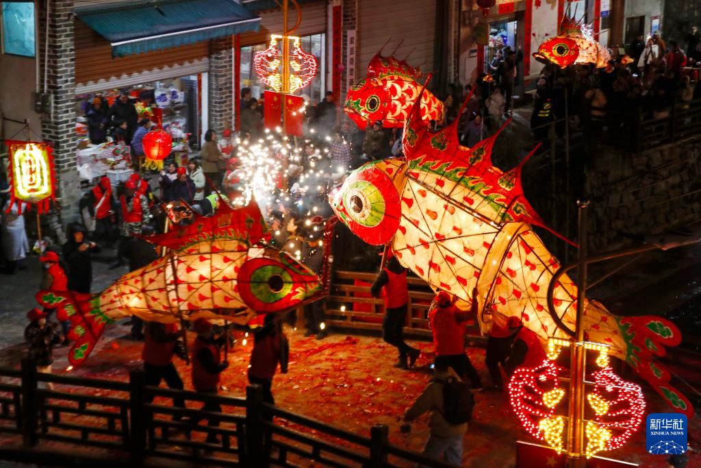 当晚,非遗民俗汪满田鱼灯在安徽省黄山市歙县溪头镇汪满田村热闹开演。村民自制鱼灯,带着“平平安安、年年有余”的美好祝愿,巡游祈福,点亮夜幕中的徽州古村,喜迎元宵佳节。歙县汪满田鱼灯至今已有600多年历史,被列入安徽省级非物质文化遗产代表性名录。