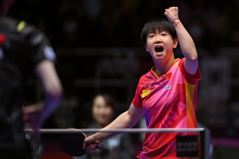 2月24日,中国队选手孙颖莎在第四盘比赛中庆祝得分。新华社记者 陶希夷 摄